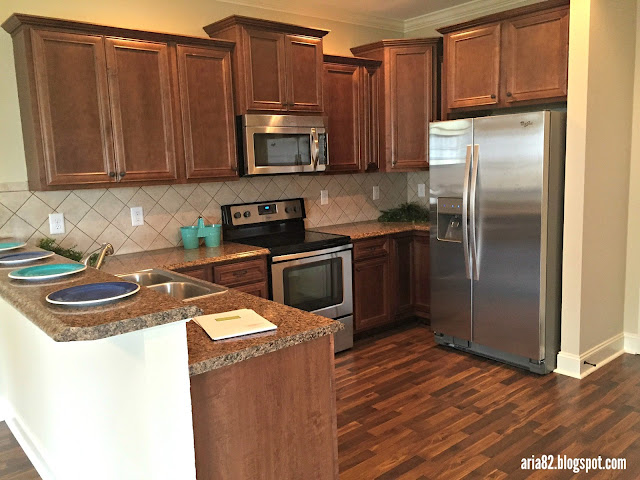 This kitchen is really great for us, has enough counter space, has enough cabinet space and I love the floors. It gives me a little backsplash action and it looks like it can fit a monster fridge, which is awesome.