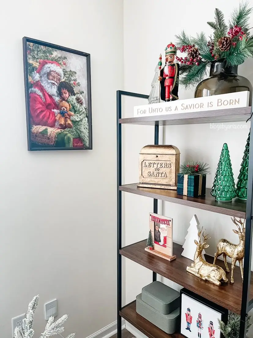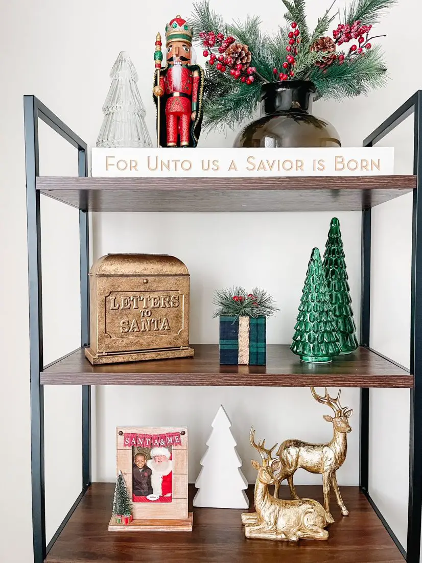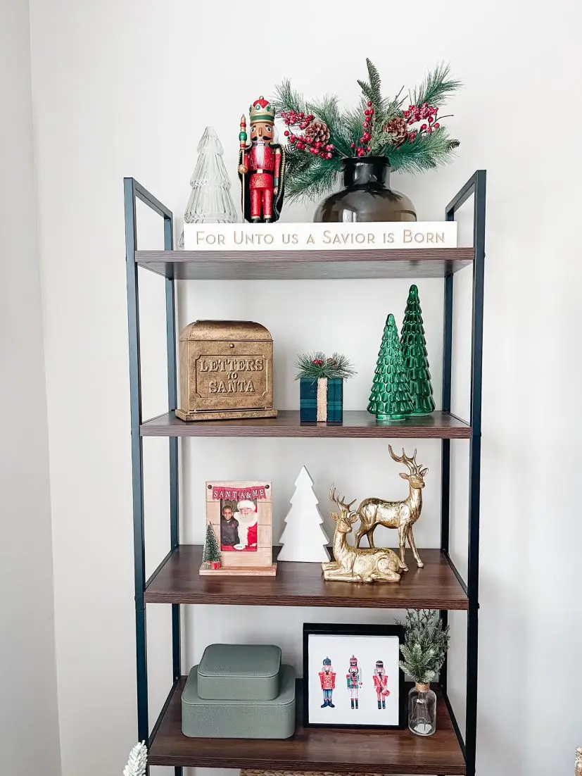 Let’s take a look at how I styled my bookshelf on the left. I started with a few greenery picks in a vase. This vase allows just enough height to style florals but I often leave it empty. Along with the vase I have a nutcracker, a glass tree and a long sign.