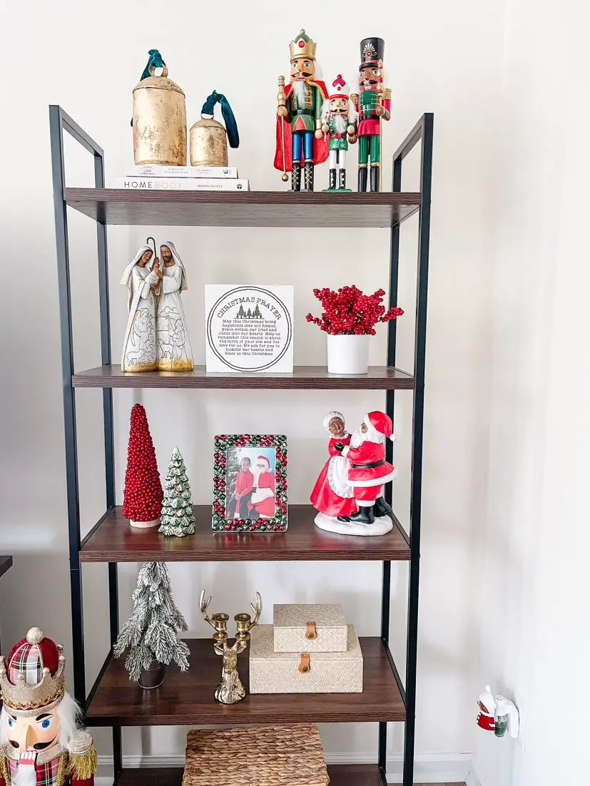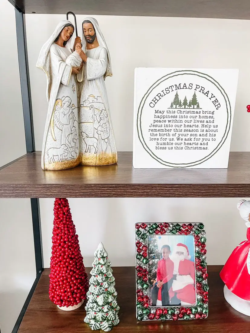 My Christmas shelves wouldn’t be complete without my Holy Family figure. I got it from Hobby Lobby a couple of years ago and was shocked to see a brown option. I get asked about it all the time!